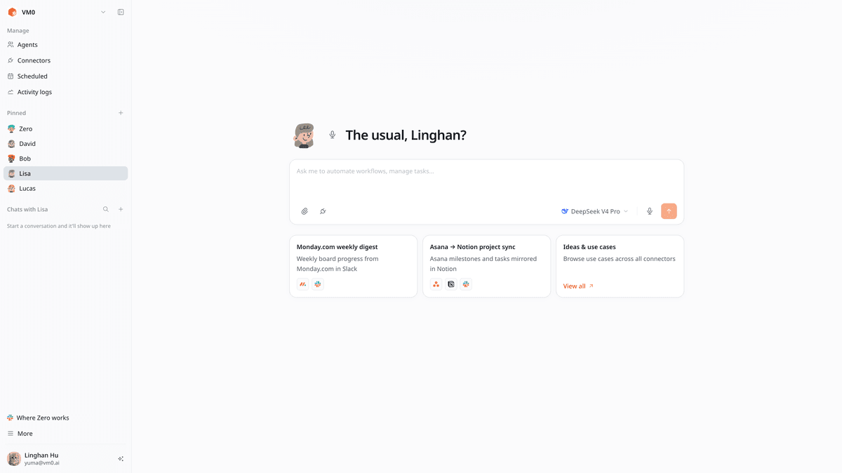Nachher: das neue Zero. Ein KI-Arbeitsbereich mit angepinnten Agents und Use-Case-Karten.